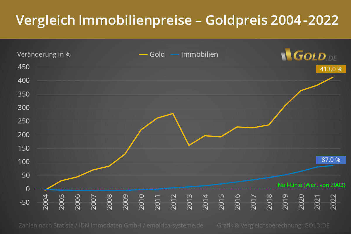 Von 2004 bis 2022 ist der durchschnittliche Preis für eine Immobilie in Deutschland um 87% gestiegen – der für Gold um 413%. Ich habe bewusst die obige Grafik gewählt, die einen für Gold ungünstigen Zeitraum von 2004 – 2022 zeigt. Ab 2022, dem Ende der Grafik, bis 2025 hat sich der Preis für Gold verdoppelt. Da sähe dann nochmals viel extremer aus: Von 2004 bis 2025 ist Gold um mehr als 800% gestiegen. Und Deine Immobilie?